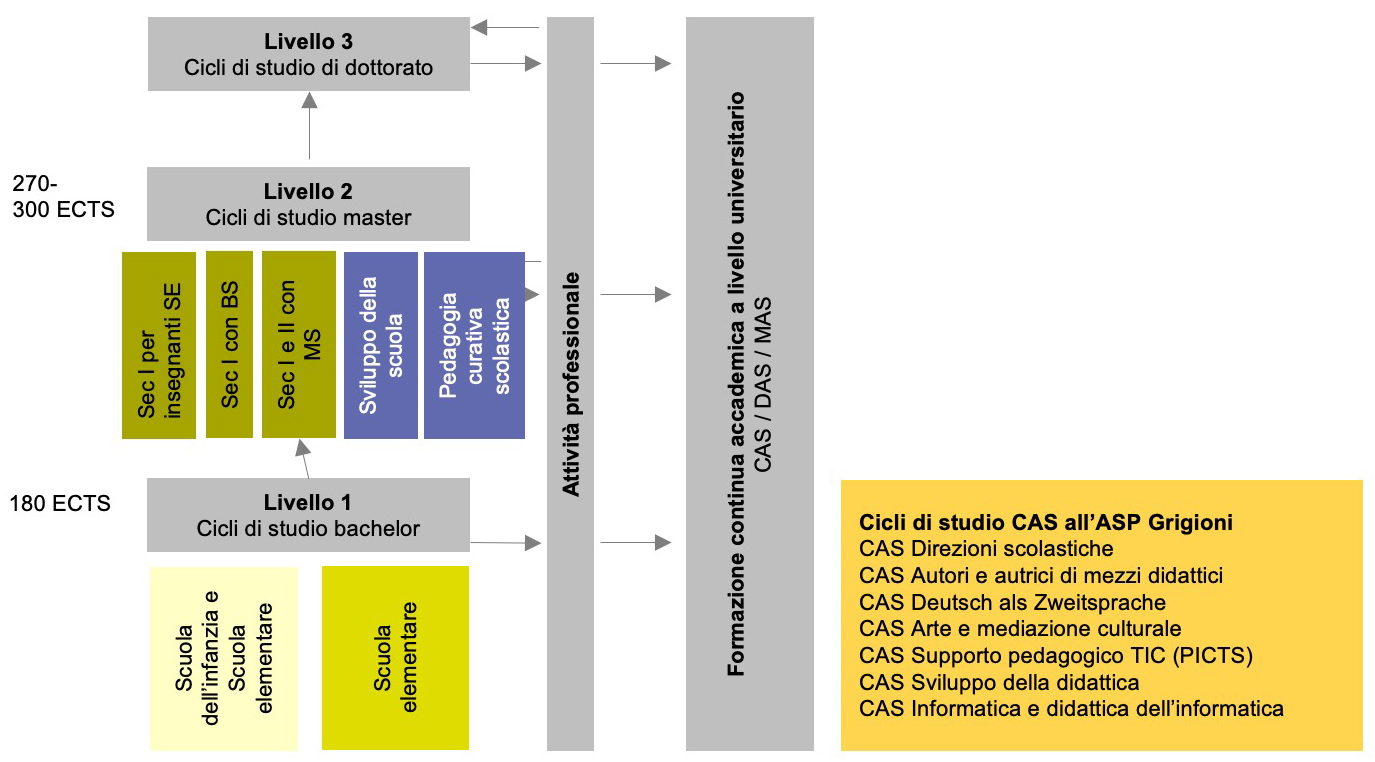 L’inserimento dei cicli di studio nel quadro nazionale delle qualifiche (qnq-ch) mostra i cicli di studio bachelor e master al primo e secondo livello della formazione accademica di base. Il terzo livello accademico con i cicli di studio di dottorato e il relativo diritto di conferire il titolo di dottore rimangono appannaggio delle università e dei politecnici federali. La formazione accademica continua a livello universitario contribuisce in modo significativo al processo di professionalizzazione delle e degli insegnanti. Questo processo di professionalizzazione comprende la formazione accademica di base, la fase di introduzione professionale e da cinque a dieci anni di esperienza professionale. L’illustrazione 2 mostra i cicli e gli indirizzi di studio offerti dall’ASP Grigioni.
